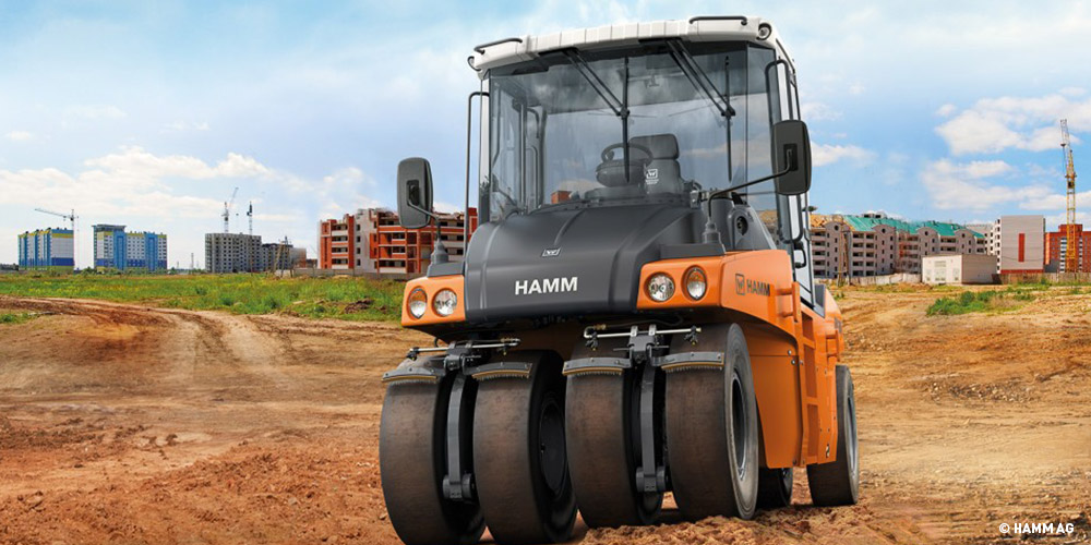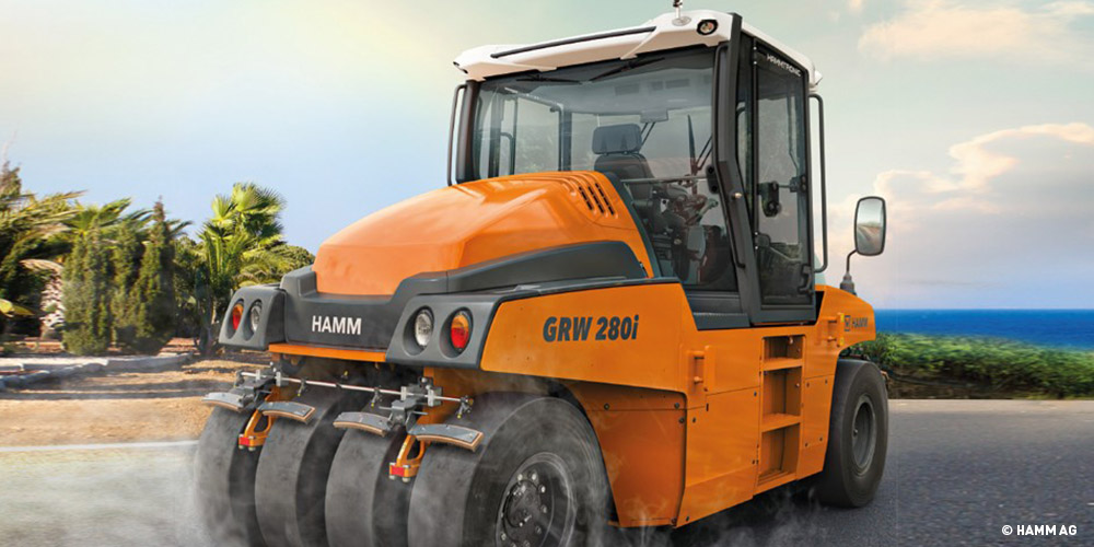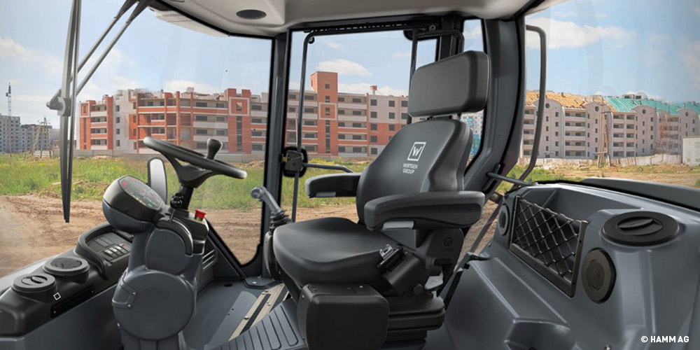 Bei den gängigen Gummiradwalzen liegen Fahrerstand und Kabine hinter der Maschinenmitte, bei der neuen GRW-Linie der HAMM AG liegen sie davor. Damit auch vor dem Motor, der – im Rücken des Fahrers – die Sichtverhältnisse nicht mehr einschränkt. Den Platz vor der Kabine nimmt jetzt der Kunststoffwassertank ein, der durch seine Möglichkeiten der Ausformung optimale Sichtverhältnisse nach vorne gewährleistet, egal aus welcher Sitzposition. Der Fahrersitz in der Panoramakabine (mit integriertem Rops) ist mit Konsole seitlich zu den Maschinenaussenkanten verschiebbar und drehbar angeordnet, wo bislang teils zwei Fahrerplätze den begehbaren Raum in der Kabine stark einschränkten. Bedien- und Anzeigenelemente sind an der Konsole platziert und damit immer optimal im Blickfeld des Fahrers. Der Einstieg in die Kabine ist beidseitig möglich.