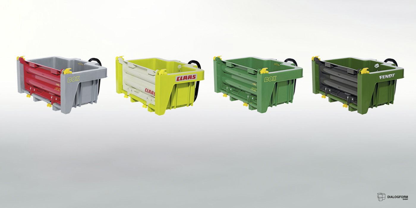 Die kippbare Transportbox wird einfach an den Anhängerkupplungen der rolly toys Traktoren aufgesteckt. Zum Kippen kann die hintere Bordwand auf zwei unterschiedliche Arten geöffnet werden, entweder schwingend oder abklappbar. So ist die Box für den Transport von Schüttgut ebenso gut geeignet ist, wie für alle sonst denkbaren Transportgüter, die sich aus dem Kinderspiel ergeben, unbegrenzt im Spielwert.
